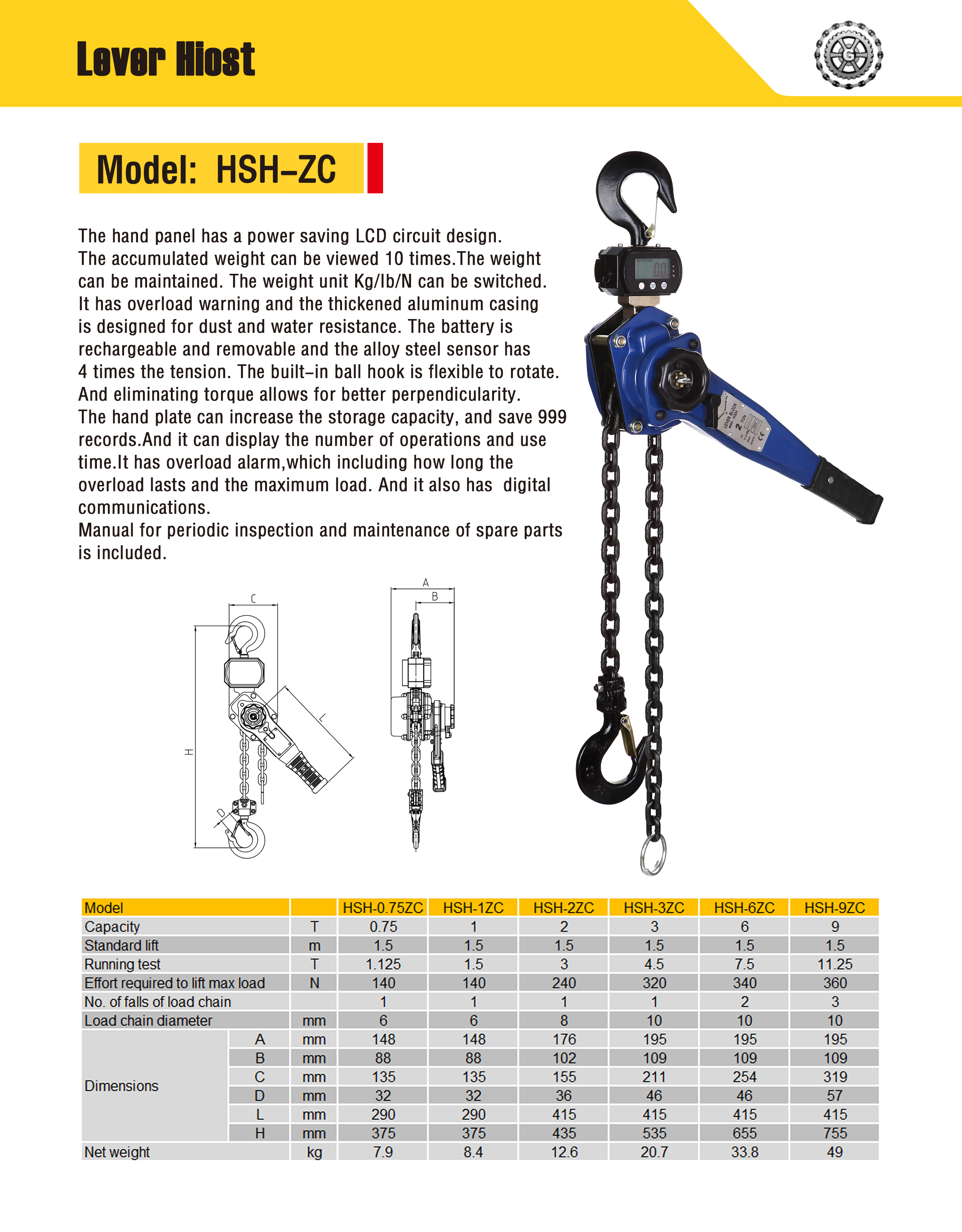 Le panneau manuel est doté d'un circuit LCD à économie d'énergie. Le poids accumulé peut être visualisé 10 fois. Le poids peut être maintenu. L'unité de poids Kg/Ib/N peut être commutée. Il dispose d'un avertissement de surcharge et le boîtier en aluminium épais est conçu pour résister à la poussière et à l'eau. La batterie est rechargeable et amovible et le capteur en acier allié a une tension 4 fois supérieure. Le crochet à boule intégré est flexible pour tourner. Et l'élimination du couple permet une meilleure circularité.